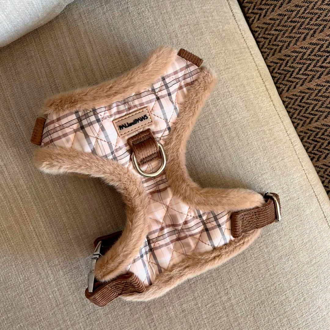 Las tiras ajustables de este arnés son de pana, con hebillas de metal. Cuenta con un anillo en D en la parte delantera para agregar una chapita.